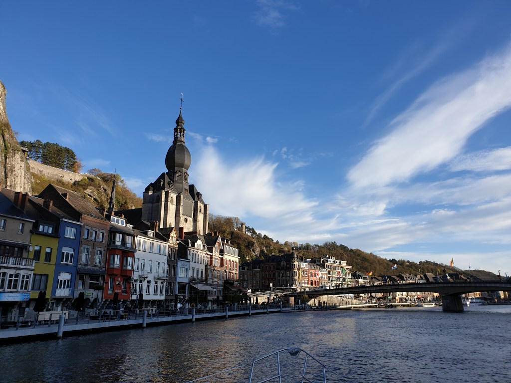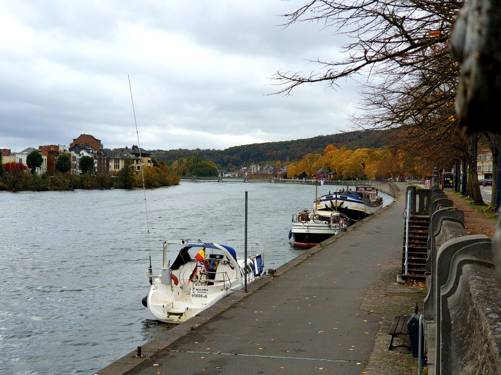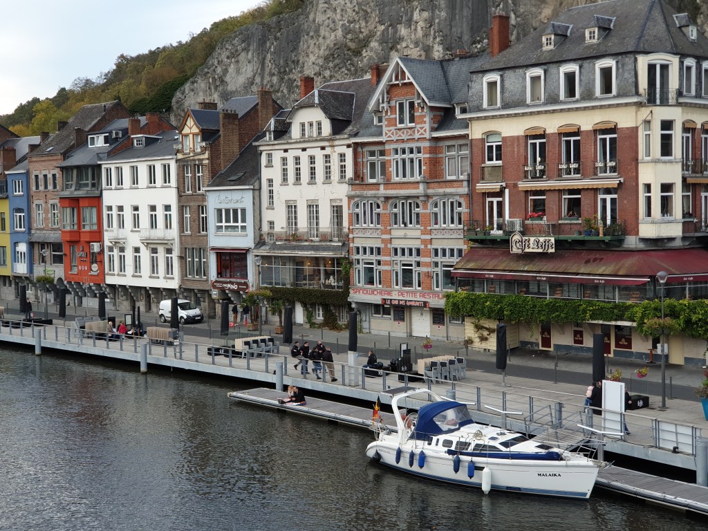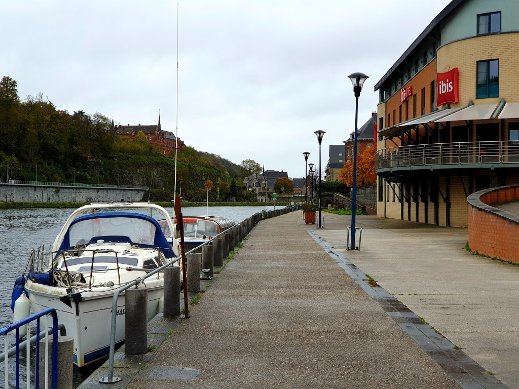 Nachdem es mir wieder besser ging, fuhr ich weiter nach Dinant in den Ardennen. Ich kam am letzten halbwegs noch warmen Tag nach unglaublich schöner Fahrt in Dinant an, und am Maas-Hafen sassen viele Leute in der Abendsonne. Für die nächsten Tage war kühles und regnerisches Wetter angesagt. Ich legte an, und es war dann wieder einer der schönsten Abende der ganzen Reise. In den nächsten Tagen bereitete ich mich auf Frankreich vor und parkte das Boot vor einem Ibis-Hotel, etwa 15 km vor der Grenze. Dort herrschte ein extremes Regime: zum frühstücken musste man eine telefonische Bestellung aufgeben und auf Rückruf warten, Dann wurde man nach unten gerufen, wo eine vermummte Angestellte eine Papiertüte auf einen Tisch stellte und sich dann wie in einem OP-Saal langsam rückwärts entfernte. Man nahm dann die Tüte aufs Zimmer um dort zu frühstücken.
