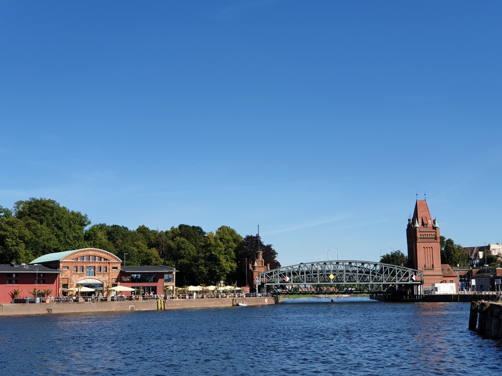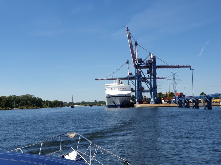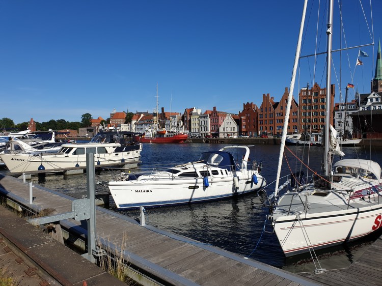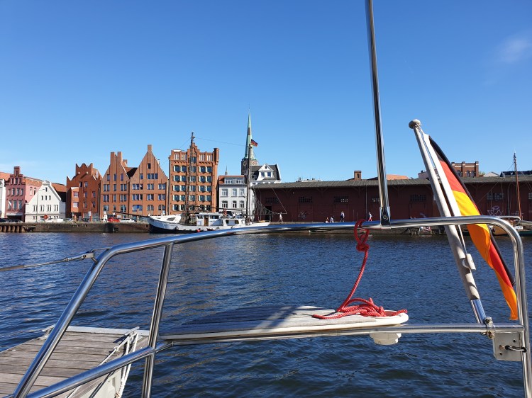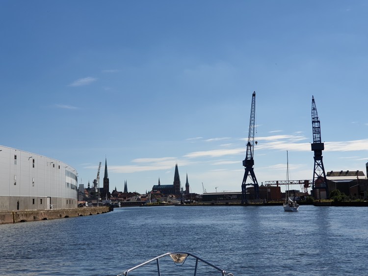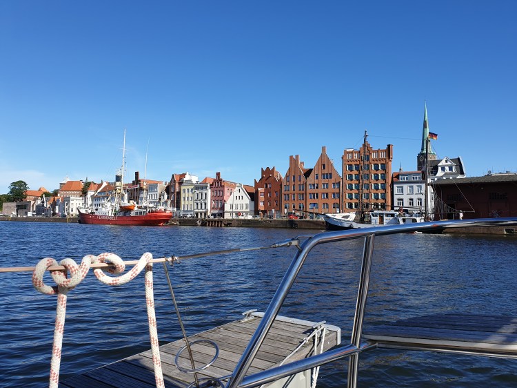Ohne Mast fuhr ich am 31. Juli 2020 die Trave rauf bis Lübeck und machte mitten in der Stadt bei einer ganz schicken Marina fest, gegenüber vom Feuerschiff Fehmarnbelt. Die Trave ist tatsächlich ein schönes Gewasser. Manchmal schmal, manchmal breit mit angeschlossenen Seen. Bis Lübeck kommen noch Frachter rein. In Lübeck habe ich mich dann gefreut eine alte Freundin zu treffen und zu checken wie es weitergeht. Es gibt nämlich drei Wege weiter zum Elbe-Lübeck-Kanal (ELK). Aber eigentlich blieb nur der Weg über die Hubbrücke Lübeck, die ich mir vorher schon mal angeschaut hatte. Ich parkte an der Hubbrücke und rief (noch mit Seefunk, hatte da noch kein UBI, nur SRC) an. Der Brückenwärter war etwas erstaunt und kam gleich runter und wir hatten ein sehr nettes Gespräch am Boot. Vorsichtig wollte er mich überzeugen doch einen der anderen Wege zu nehmen, aber mir erschien der die Wassertiefe zu knapp und dann war da noch eine tiefe Brücke. OK, ohne Wartezeit absolvierten wir das gleich in Rekordzeit: während ich mit Vollgas ranfuhr, hob er die Brücke vor mir nur ganz kurz auf 3m an um den Verkehr nur ganz kurz zu unterbrechen. Und die Brücke fuhr wieder runter als ich ich noch durchfuhr. Das klappte prima.