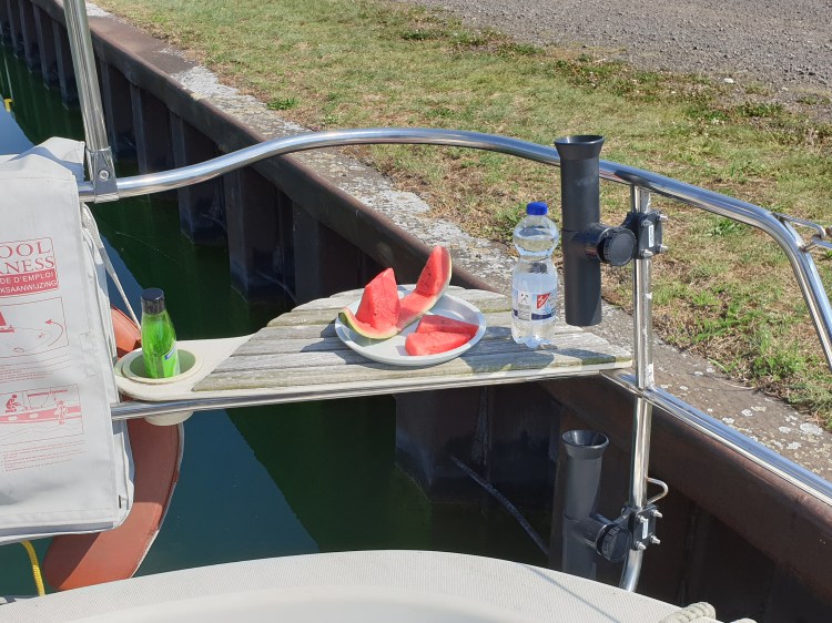Es wurde immer heisser und ich hatte zu wenig zu trinken eingekauft. Unterwegs machte ich kurz einen Stopp um noch einmal die Bilge zu checken. An der abgelegenen Anlegestelle gab es große Aufregung: bei einem Motorboot war der Motor regelrecht geplatzt: Kühlwasser und Öl liefen ins Boot. An Bord war ein Pärchen und der Mann schwamm mit einer Leine ans Ufer und konnte sein Boot hinterherziehen. Gleich überlegten alle vor Ort was man tun konnte. Ich konnte nicht abschleppen. Aber eine entfernte Marina wurde angerufen und nach einer Stunde war plötzlich eine große Motoryacht da mit zwei feiernden Familien. Gut gelaunt wurde der Havarist dann auf den Haken genommen. Vorher schenkte man mir noch Melonen, ich war richtig gerührt, denn das Geschenk kam von dem Pärchen dessen Boot nun einen teuren Motorschaden hatte.