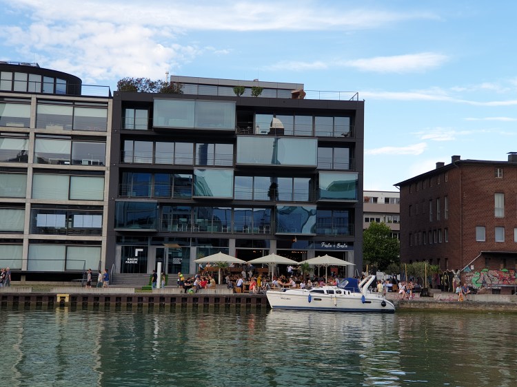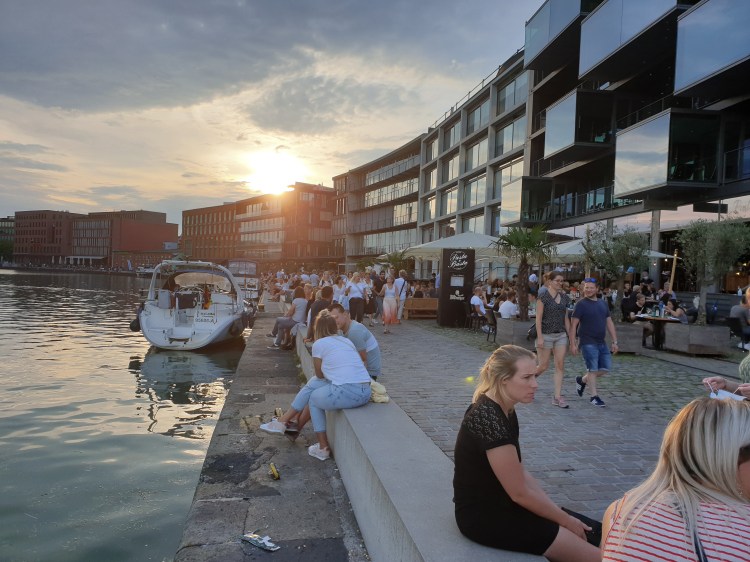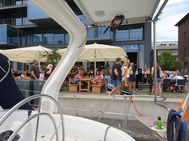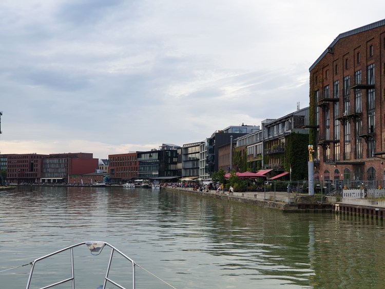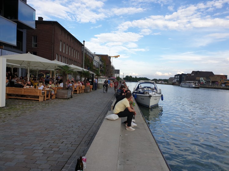 Über den Dortmund Ems Kanal (DEK) kam ich am frühen Abend bei großer Hitze nach Münster. Kurz nach der Münster-Schleuse wurde es immer voller: hunderte von Erwachsenen und Kinder waren im Wasser oder am Wasser unterwegs. Alle schienen gute Laune zu haben. Schlauchboote und Luftmatratzen waren unterwegs, und dazwischen in langsamer Fahrt Frachtschiffe und Sportboote. Hin und wieder musste ich hupen, so dicht kamen die Kinder vor den Bug. Dann gings nach ca 2 Kilometern rein in den Stadthafen von Münster, wo ich etwas erschöpft bei hunderten gut gelaunten Hafenbesuchern anlegte. Mehrere Leute wollten gleich wissen wo ich herkomme und halfen beim festmachen. Abends zog immer wieder die MS Günther vorbei, voller tanzender Leute ohne Schutzmaske. Die MS Günther ist nach dem Fernsehmoderator Günther Jauch benannt und der Schiffseigner gewann einmal eine Million Euro beim RTL-Wettbewerb „Wer wird Millionär“. In Münster konnte ich endlich zum Friseur und einkaufen. Es waren sehr schöne Tage.