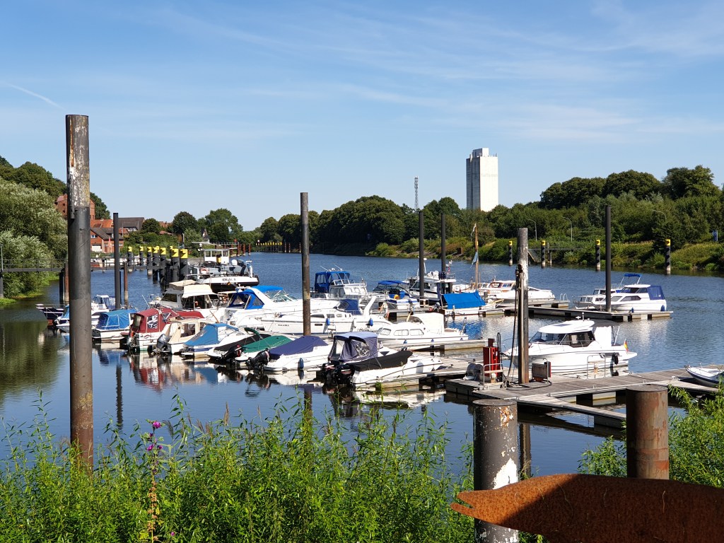 Kurz vor Braunschweig ging es vom Elbe Seiten Kanal in den Mittellandkanal (MLK), der mich dann weit in Richtung Westen gebracht hat. Der Mittellandkanal ist recht viel befahren und ist an sich problemlos. An Schleusen kann ich mich ausser der Schleuse Anderten bei Hannover nicht erinnern. An einigen Stellen ist das Wasser (wie auch manchmal im ESK) relativ schmutzig und stinkt regelrecht über mehrere hundert Meter. In der Nähe von Städten springen Kinder gerne vorm Boot ins Wasser und Leute in sehr kleinen Booten sind unterwegs und ab und zu kreuzt jemand mit schwimmenden Hund den Kanal. In Braunschweig traf ich meine liebe Kusine Ela, die große Mengen Getränke und Lebensmittel eingekauft hatte. Kurz vor Hannover kommt Kusin Stephan und hilft in der Schleuse Anderten, vor der ich (mit 350+ Schleusen Erfahrung) etwas Bammel hatte. Dann geht es in aufregender Fahrt quer durch Hannover. Das habe ich (wie Münster) in sehr guter Erinnerung. Ein paar Tage bin ich im Yachtclub geblieben, wo eine nette Stimmung war. Jeder Hafen, jede Marine hat so eine eigene Stimmung, die schwer zu beschreiben ist. Bei Kusin Thomas habe ich zwei Nächte übernachtet und wir haben uns was zu essen gemacht. Danach geht es mehrere Tage immer weiter und weiter Richtung Westen über Minden, wo man die Porta Westfalika sieht und in einer Trogbrücke über die Weser fährt. Dann kommt das „nasse Dreieck“ und es geht links ab in den Dortmund Ems Kanal (DEK).