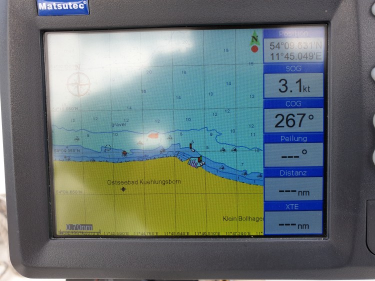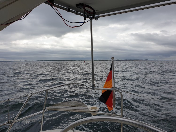 Am 9. Juni 2020 fuhr ich dann am frühen Morgen los. Mit schwachem Ostwind konnte ich teilweise auch segeln. Dennoch legte ich die Strecke zu etwa 2/3 unter Motor zurück, die Geschwindigkeit lag bei etwa 2-3 Knoten. Zeit die Beine hochzulegen, den Autopiloten laufen zu lassen, zu dösen, lesen und nichts zu tun. Natürlich wurde ich laufend von anderen Seglern abgehängt. Einer der Überholer lief dann irgendwo hinter Rerik bei Wustrow auf eine Sandbank und sass dann da fest. Mit meinem Kiel konnte ich nicht helfen. Tatsächlich muss man da in der Gegend etwas Zick Zack um Untiefen herum fahren. Vorbei gings an einer mysteriösen unbetretbaren Insel namens Walfisch und einem lustigen Seezeichen. In Höhe der Halbinsel Wustrow kam dann Wind auf und es ging schnell rum nach Poel, zwischen mehreren betonnten Untiefen durch. Zum zweiten Tag navigierte ich mit Plotter. Was für eine enorme Erleichterung! Keine Bleistifftkreuzchen mehr in der Papierkarte und rumtüfteln. Konnte sogar die Abdrift gut gefühlsmässig in den Griff kriegen. Bei der Einfahrt nach Kirchdorf in Richtung Norden hatte ich Gewitter mit starkem Gegenwind und wenig Raum im Fahrwasser. So kam ich da nur mit etwa einem Knoten voran und brauchte Stunden für die kurze Strecke. Wegen des Windes schaute ich in schräger Fahrt nicht nach vorne sondern ähnlich wie beim Motorflug zur Seite, und war völlig durchnässt vom Regen.