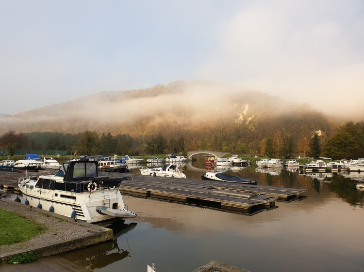 Und nun wartet das Boot seit November 2020 im kleinen, und gut geschützten Hafen von Anseremme in den Ardennen darauf daß es irgendwann weiter geht. Die letzten Gerüchte besagen daß es Anfang Mai 2021 wieder erlaubt sein könnte nach Frankreich einzureisen. Eine andere Solo-Bootfahrerin rief mich inzwischen an: sie sitzt fest, rund 50 km hinter der Grenze. Sie darf zu Fuß oder mit Fahrrad sich maximal 10 km weit vom Boot entfernen.