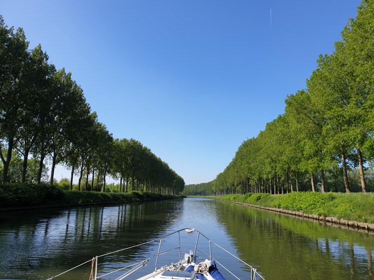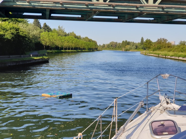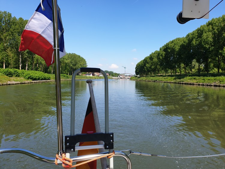 Von Peronnes in Belgien gings dann endlich Richtung Süden auf die Escaut (Schelde). Nach wenigen Kilometern kam ein altes vergammeltes ehemaliges Zollhäuschen in Sicht und ich hängte die französische Flagge auf. Es ist hier ein typischer Transportkanal, mit etwa 2-3 Schiffsbegegnungen pro Stunde. Keine Sportboote, nur Frachter. Entgegen meinen Befürchtungen hat hier die Schelde nur eine sehr geringe Gegenströmung, geschätzt um 1 km/h. Nach knapp 50 km gings es nach rechts in den canal de la Sensee, auf dem es sich in etwa so fährt wie auf der Schelde.
