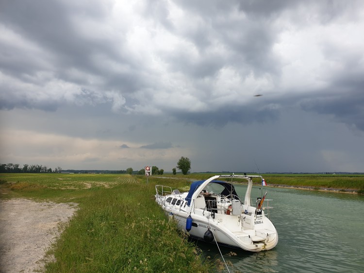 Wie zuvor sah ich kaum kleine Boote. In den ganzen Tagen auf diesen Gewässern sah ich nur zwei Sportboote und es wurde wild gewinkt. Anhalten für die Nacht war schwierig. Ich musste stets bei Haltestellen für die Frachter halten. Die sehr wenigen Häfen haben alle Wassertiefen von rund 1,30m. Einen guten Platz fand ich in Peronne (nicht zu verwechseln mit Peronnes in Belgien) neben dem Sportboothafen (1,3m WT), auf der gleichen Seite (Frachthafen). Von da aus konnte ich endlich Getränke in einem nahen Lidl-Supermarkt einkaufen. Da ich schon früh nach Haltestellen suchte und früh anhielt, waren die einzelnen Tageskilometer nicht so berauschend. Meistens zwischen 25 und 40 km pro Tag bei Geschwindigkeiten um 7 km/h. Ganz allmählich stieg die Motortemperatur an, von 70 Grad auf 78 Grad, und am nächsten Tag auf 80 Grad C. Das machte mir große Sorgen da ich die Ursache nicht finden konnte. So drosselte ich etwas die Geschwindigkeit auf 6,5 km/h (jedesmal mit GPS-Messung per Handy). Wahrscheinlich ist das Kanalwasser wärmer geworden und die geringere Wassertiefe fördert die Erwärmung noch. Beim Drehen der Propellerwelle mit der Hand ist alles normal. Der ab und zu gereinigte Wasserfilter sah sauber aus. Aus anderen Fahrten in Frankreich kann ich mich an ein dickes Gewusel alter Angelleinen erinnern, die sich an der Schraube verfingen und was dazu führte daß mit mehr Gas gefahren werden musste, man merkte das Problem anfangs nicht. Mit einem Tauchgang habe ich damals alles abgeschnitten. Das war hier nicht der Fall. Meine wasserdichte Kamera von Nikon hatte ich leider vergessen. Die hätte ich auf Video schalten können und mit Klebeband an einem Stock unter Wasser halten können. So hatte ich das noch von zu Hause aus vorausschauend geplant. Ich hoffe der Impeller ist noch intakt.
