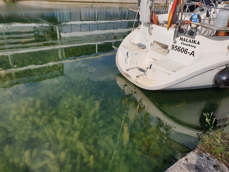 Schlimm war es in St. Dizier. Dort musste ich mitten im Dreckwasser des Kanals reinspringen. Noch schlimmer waren die 20 Kilometer nördlich von Joinville. Ich kam nur mit 2 km/h voran, musste den Tag über zwölf mal tauchen und einmal das Seeventil säubern. Etwa 500m lang musste ich alle 100m die Schraube von Pflanzen befreien. Das Wasser war örtlich nicht sauber, musste trotzdem tauchen denn der Motor schaffte nur eine niedrige Drehzahl und ich hatte keine Wahl. Im Wasser finden sich teilweise tote Fische und die VNF-Verwaltung warnt mit Schildern vor dem Baden wegen der Gefahr einer Leptospirose-Infektion durch infizierte Ratten. Erreger ist die Spirochäte Leptospira interrogans, ein gram-negatives Bakterium. Teilweise hatte ich zwischen den Pflanzen fast keine Sicht und musste mich in Dunkelheit wie in einem Wald orientieren. Einmal hatte ich sogar mit den Füssen Kontakt zum Boden, so flach wurde es. Unangenehm sind Wasserpflanzen, die kleine Dornen haben und beim Entfernen stechen. Andere Pflanzen, die ich noch nicht identifiziert habe, brennen wie Brennnesseln auf der Haut. Um das gestoppte Boot in die Mitte des Kanals zu bugsieren benutze ich manchmal einen Anker, den ich weit werfe und an dem ich das Boot manövieren kann. Oder ich versuche es mit einem Paddel oder schiebend beim schwimmen. Meist blieb das Boot aber einfach fest stecken und ich konnte dann tauchen.